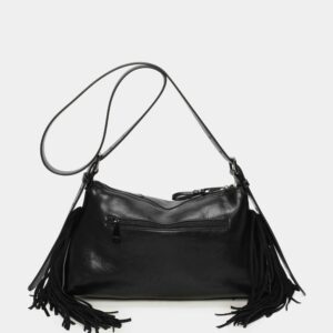 Bolso bandolera Kate confeccionado en pu de alta calidad y flecos de antelina. Está disponible en color negro, moka, cuero y bordo. Se accede a su interior por medio de una cremallera superior. En él, encontramos 3 bolsillos, uno de ellos con cremallera. Los detalles metálicos son de color nickel.