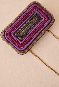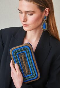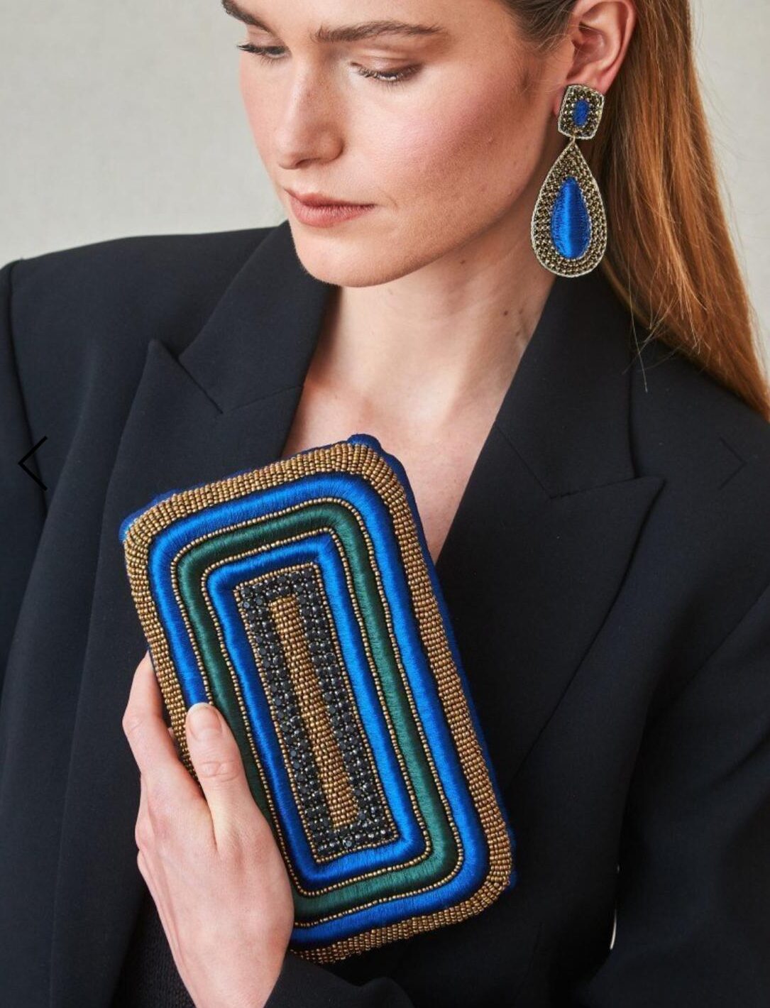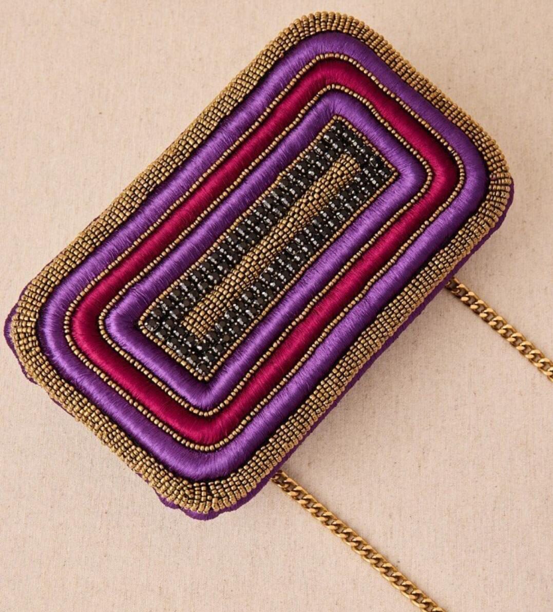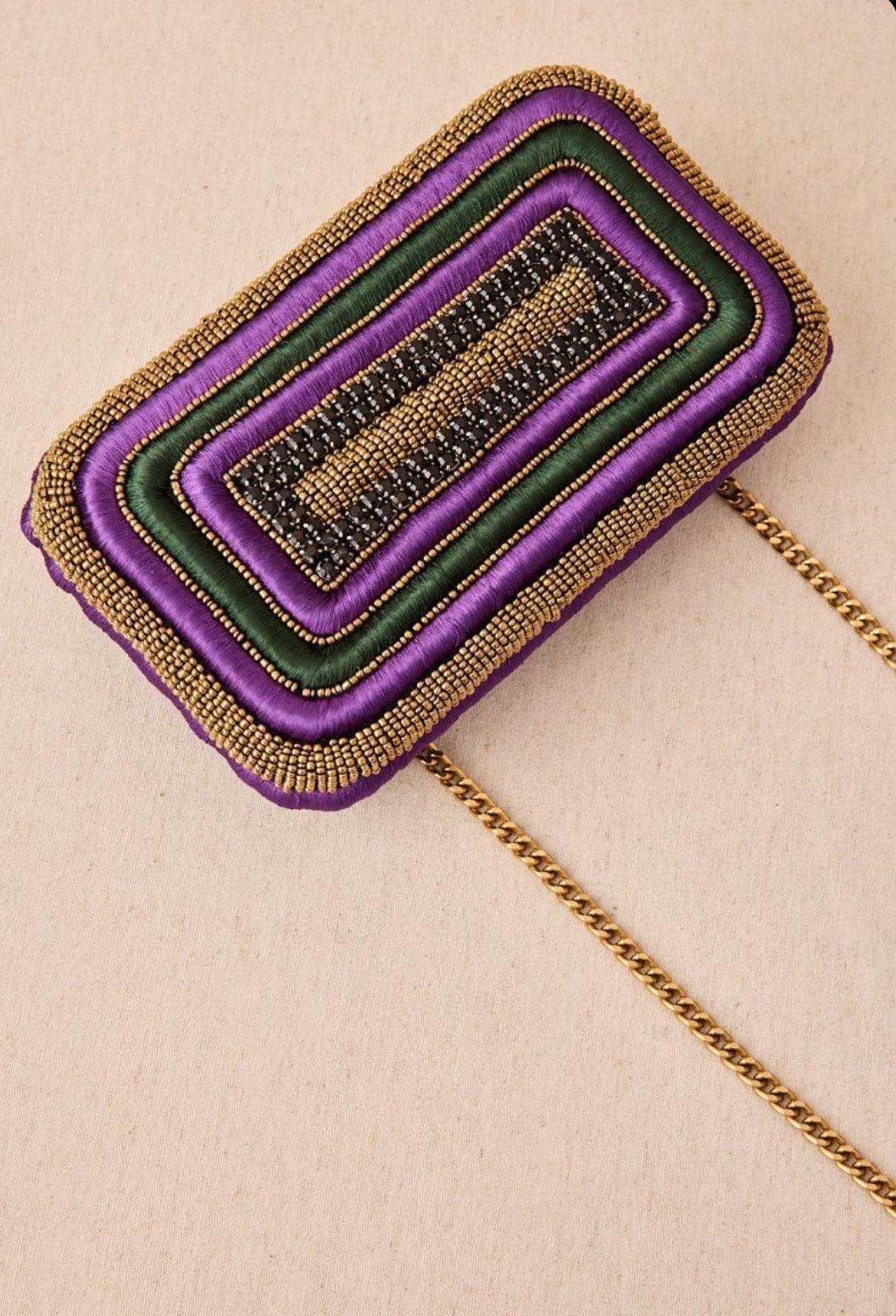 Espectacular Clutch joya todo bordado a mano en un diseño de geometrías, que lo convierten en una pieza única. Su estructura compacta y su acabado artesanal lo convierten en un complemento especial para eventos y celebraciones.