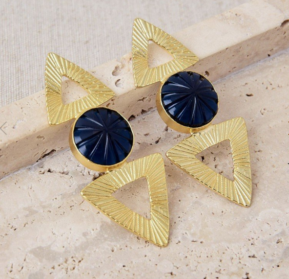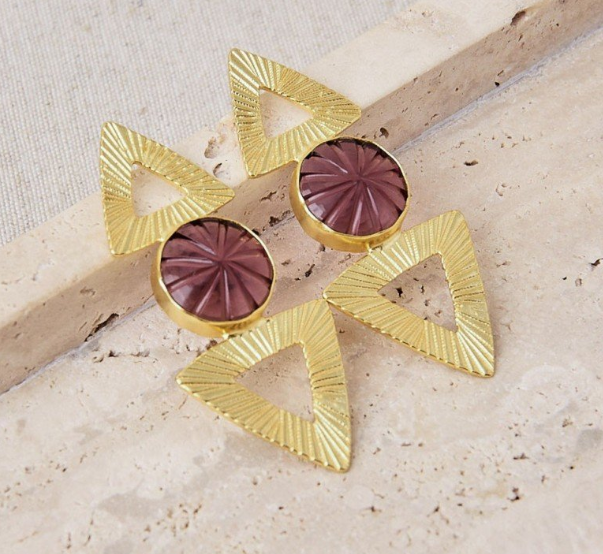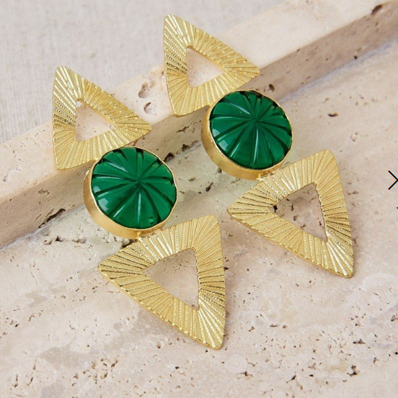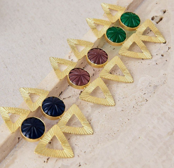 Pendientes con base triangular de latón con baño de oro y piedra semipreciosa tallada en forma circular, disponible en varios tonos intensos.